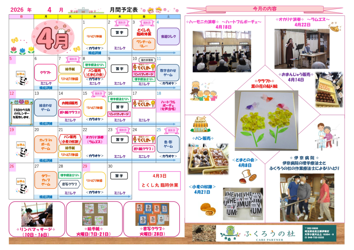 デイサービスセンターふくろうの杜 令和8年4月の月間予定表をアップしました! 2026.03.31 令和8年4月の「ふくろうの杜」の月間予定表をアップしました。 クラフトの日は菜の花の貼り絵、ハーモニカやオカリナ演奏も予定しています! 伊奈病院の理学療法士とふくろうの杜の作業療法士によるリハビリも実施します。 ぜひご利用ください。お待ちしております!! ※画像をクリック(タップ)すると拡大してご覧いただけます。